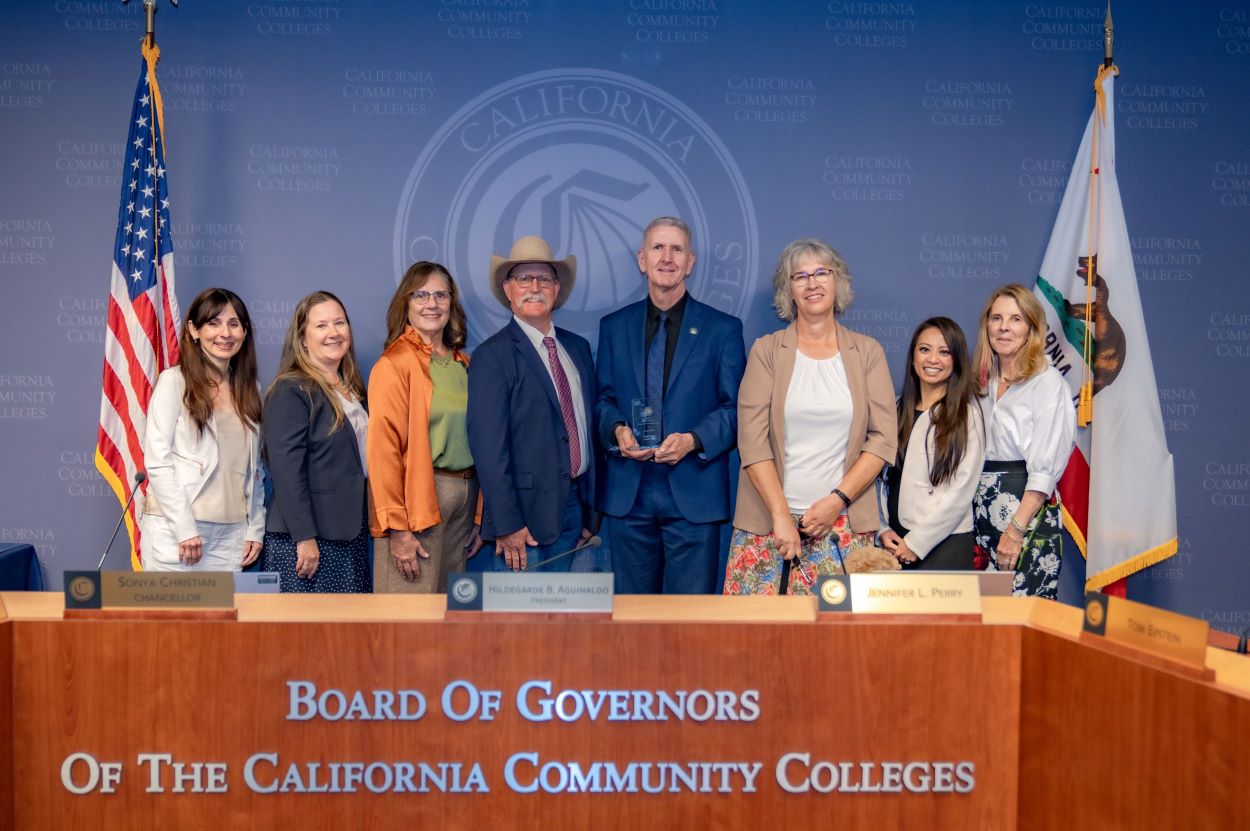 REDDING, CA – Shasta College’s school color reflects its commitment to “green” innovations, and those efforts were recognized on March 24, 2026, by the Board of Governors in Sacramento. Superintendent/President Dr. Frank Nigro, along with Dean Mark Klever, Horticulture instructor Leimone Waite, and Director of Food Services Denise Axtell, were present to receive the 2025 Excellence in Energy and Sustainability – Innovative Project award.